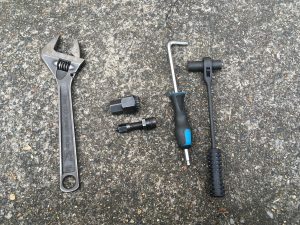 クランクプーラーを差し込み、クランク側右回し、その後モンキーレンチで固定。