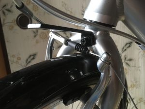 ②Vブレーキにキャリア取り付けして、カゴを取り付けするタイプ。